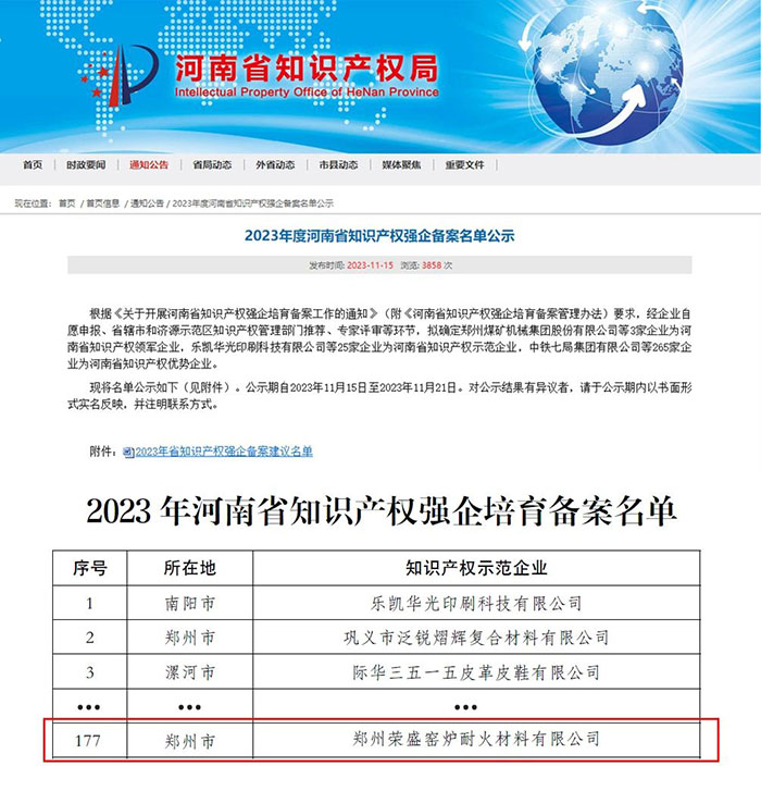 近日,河南省知識產權局公布2023年度河南省知識產權強企備案名單,鄭州榮盛窯爐耐火材料有限公司(以下簡稱「榮盛耐材」)榮獲「知識產權優勢企業」稱號,知識產權綜合實力獲官方認可。這是今年以來,榮盛耐材在知識產權領域獲得的又一項榮譽。