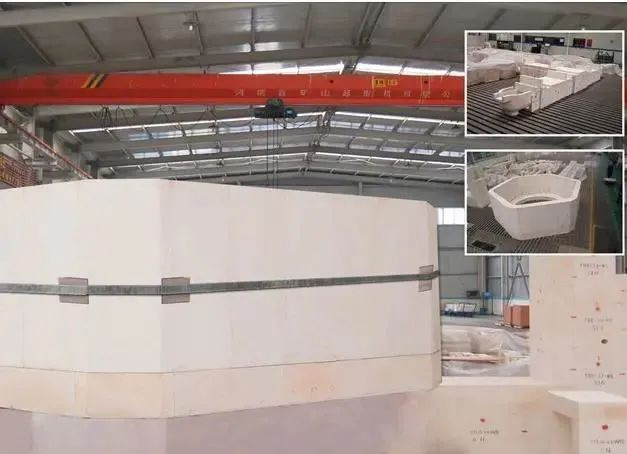 其產(chǎn)品優(yōu)點(diǎn)為:①使用了電熔氧化硅結(jié)合相,不含氧化鈣成分,二氧化硅含量可達(dá)98.5%以上;②密度更小(1.8g/cm3),降低了整個(gè)大碹的重量;③價(jià)格相比同級(jí)別電熔材料更低;④比硅磚具有更低的膨脹系數(shù)(650℃時(shí)0.6%)、更高的使用溫度(T0.5為1690℃);⑤更好的體積穩(wěn)定性。在國(guó)內(nèi)某全氧燃燒窯爐上有使用經(jīng)歷,但大碹出現(xiàn)威脅到窯爐的變形問題。