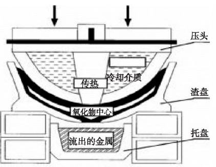 壓榨回收法的工作原理是將熱鋁灰從壓濾機上部裝入,對熱鋁灰施加靜壓或者動壓,將熔融鋁擠壓出。例如SPM法、MADOC法、COMPAL法、Thepress法等,原理如圖2所示。壓頭施加壓力,爐渣內的金屬受壓流向下層容器,在此期間鋁灰氧化迅速停止,形成的金屬殼將氧化物包裹起來,這樣既可以控制灰塵,也能減少煙氣的排出,而熱量由循環冷卻水帶走,爐渣的溫度逐漸降低到450℃以下,防止氧化的二次發生。